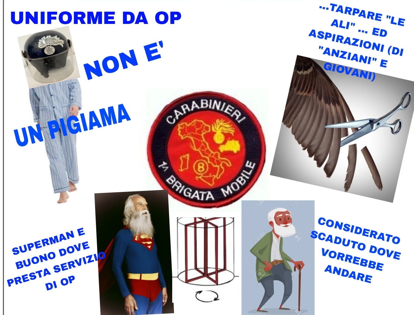Si enfatizza e ribadisce che la Tuta da Ordine Pubblico è una Uniforme dell’Arma a tutti gli effetti. Quindi non ci possiamo meravigliare di nulla se ci è toccato sentirla chiamare “Pigiama” proprio dai Vertici ed ancora sentire esclamare “questa è una Tuta e non una Uniforme” od ancora “la vera Arma dei Carabinieri è la Territoriale”. Ciò è tanto denigrante quanto offensivo in un periodo storico in cui l’Ordine Pubblico ricopre invece un ruolo sociale e di impiego di prim’ordine.